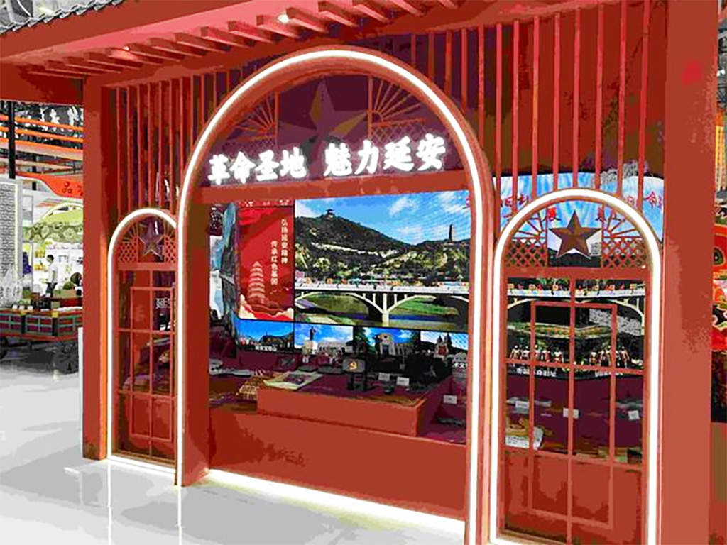 進(jìn)入唐長(zhǎng)安街,首先映入眼簾的是“革命圣地魅力延安”延安革命文化主題全景空間。該區(qū)域通過(guò)視頻數(shù)字化手法展示延安革命文化IP內(nèi)涵,同時(shí)展出的紅寶書、腰鼓酒具等紅色文創(chuàng)產(chǎn)品也別具特色。