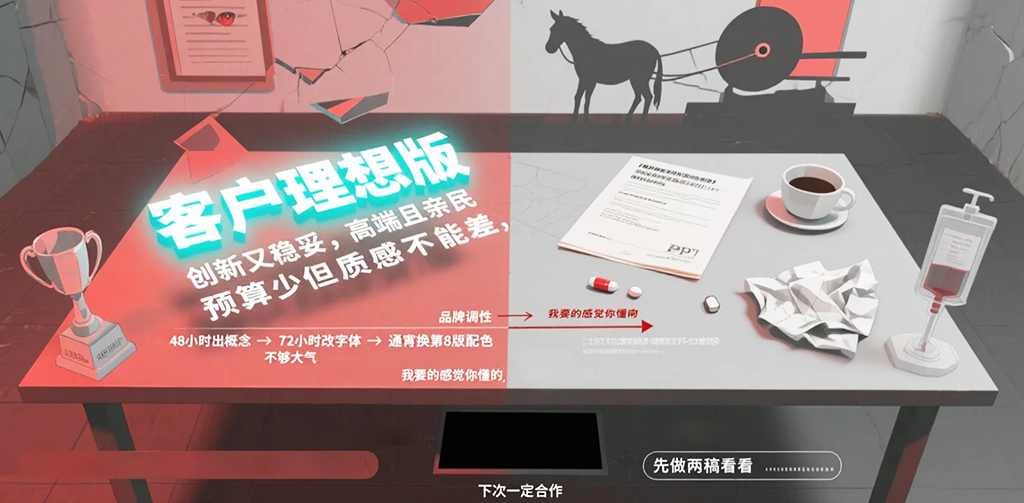 乙方5年,甲方2年。發(fā)現(xiàn)乙方的很多加班和修改都沒有意義,很多時候只是甲方的一時腦抽。騙稿也不要太過分。甚至brief的信息可能都不是準確的,只是想聽聽乙方的想法。提案過程中甲方的有些人是被拉來參會的,他不關心也沒興趣,但又必須要說點什么,所以就會有各種奇葩反饋,認真你就輸了。